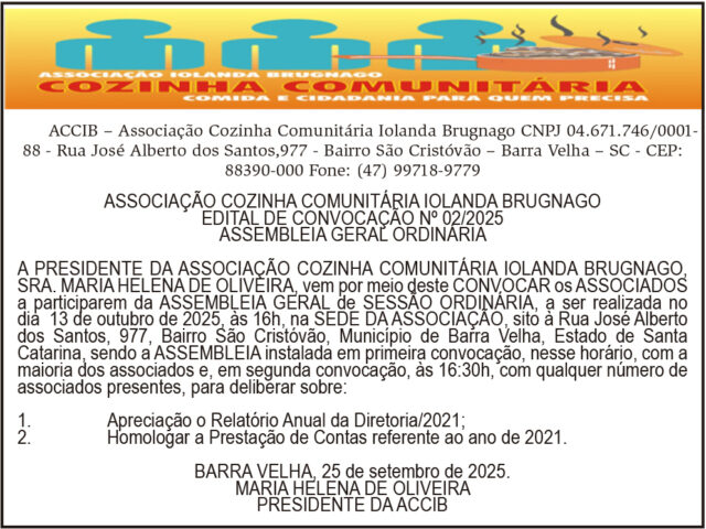 ASSOCIAÇÃO COZINHA COMUNITÁRIA IOLANDA BRUGNAGO EDITAL DE CONVOCAÇÃO Nº 02/2025 ASSEMBLEIA GERAL ORDINÁRIA