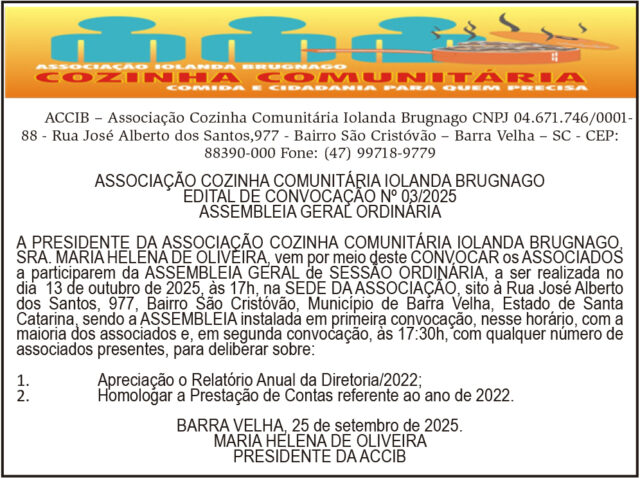 ASSOCIAÇÃO COZINHA COMUNITÁRIA IOLANDA BRUGNAGO EDITAL DE CONVOCAÇÃO Nº 03/2025 ASSEMBLEIA GERAL ORDINÁRIA
