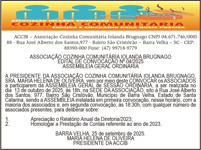 ASSOCIAÇÃO COZINHA COMUNITÁRIA IOLANDA BRUGNAGO EDITAL DE CONVOCAÇÃO Nº 04/2025 ASSEMBLEIA GERAL ORDINÁRIA