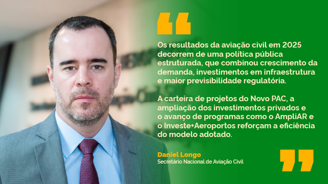 A confiança do mercado na segurança regulatória do país resultou ainda em R$ 2,6 bilhões em investimentos privados, somados a R$ 608,4 milhões em recursos públicos diretos, reforçando a modernização do sistema aeroportuário nacional.