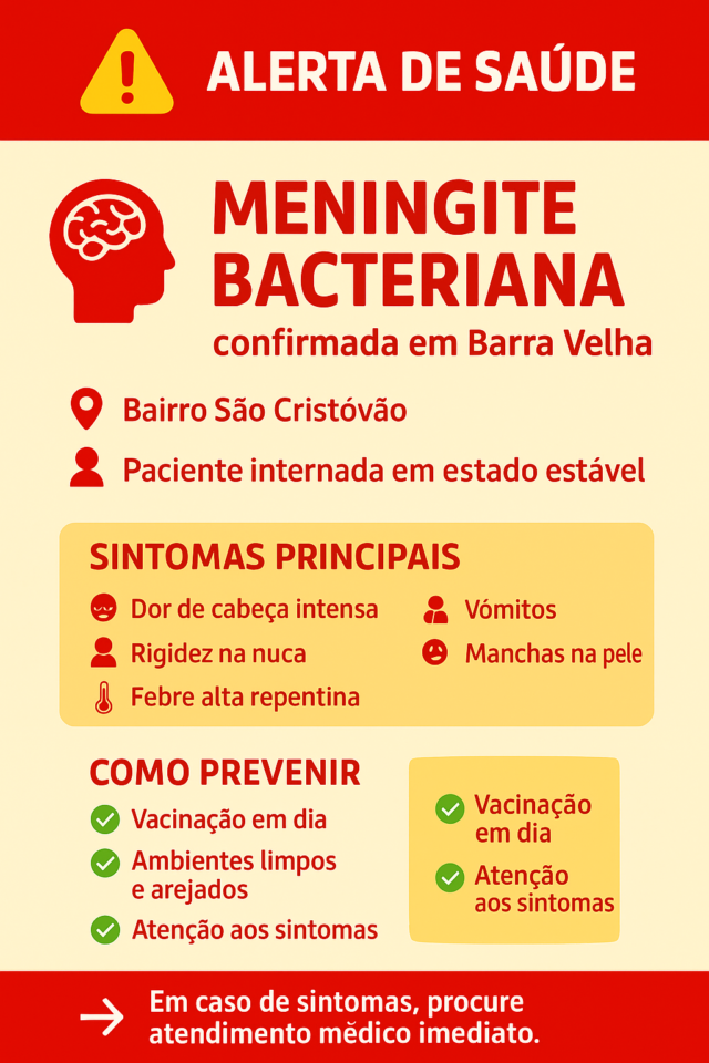 A Secretaria de Saúde alerta que, diante da gravidade da meningite bacteriana, a população deve buscar atendimento médico imediato em caso de sintomas. A vacinação segue sendo a principal forma de proteção contra a doença.
