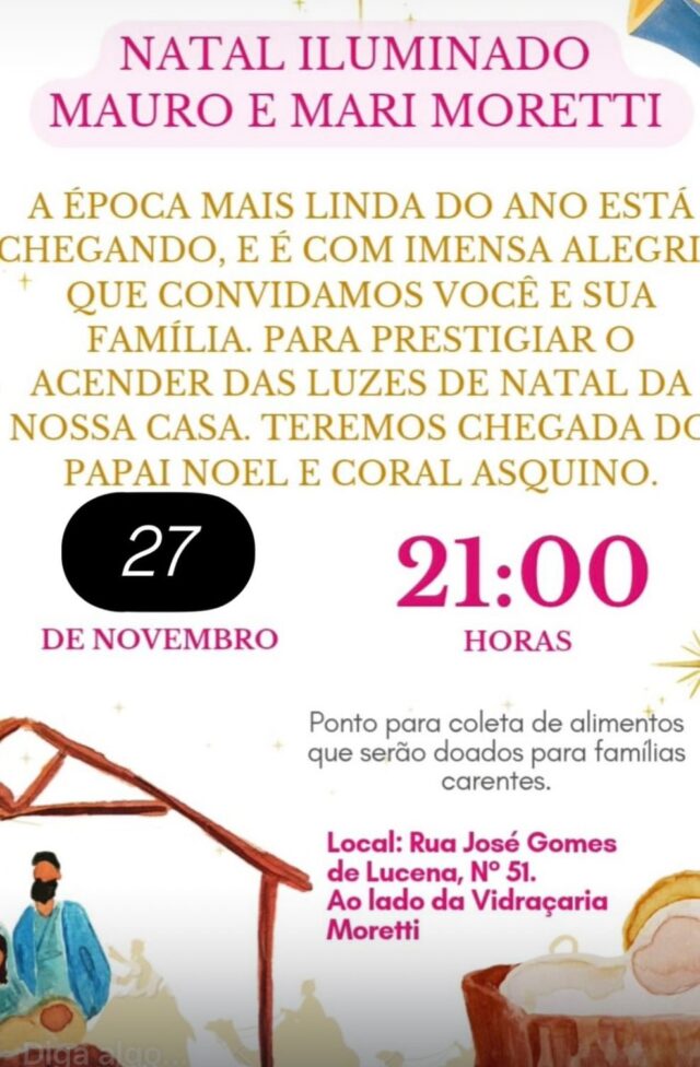 A magia do Natal ganhará um brilho especial nesta quinta-feira, 27 de novembro, com o tradicional “Natal Iluminado Mauro e Mari Moretti”, evento que há anos reúne familiares, amigos, vizinhos e moradores da comunidade para celebrar a época mais encantadora do ano.