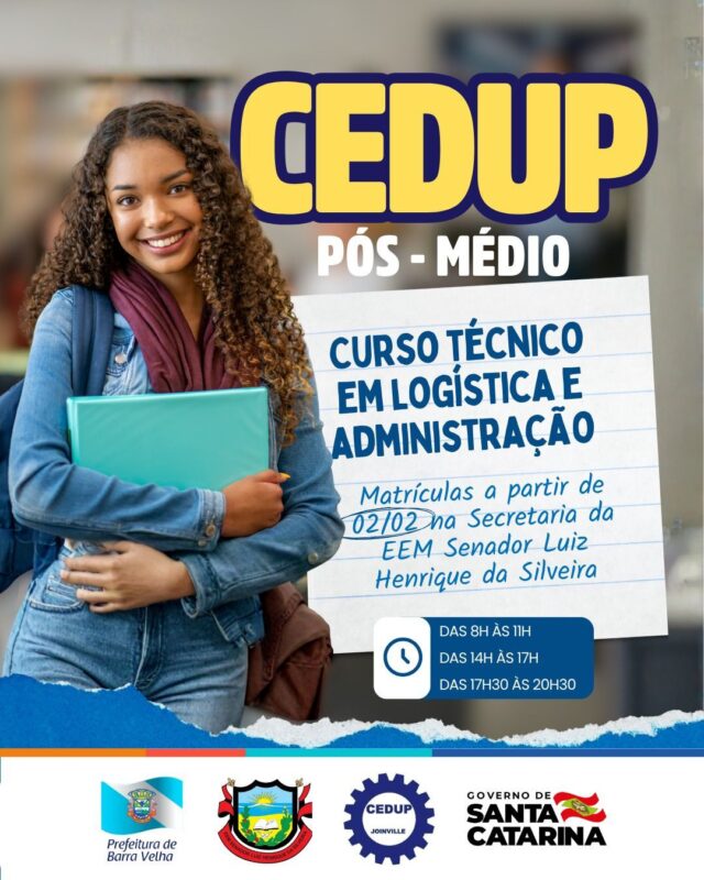 Moradores de Barra Velha e região têm uma nova oportunidade de qualificação profissional. Estão abertas, a partir desta segunda-feira (2), as matrículas para os cursos técnicos gratuitos de Administração e Logística, ofertados pelo Centro de Formação Profissional (CEDUP) de Joinville.
