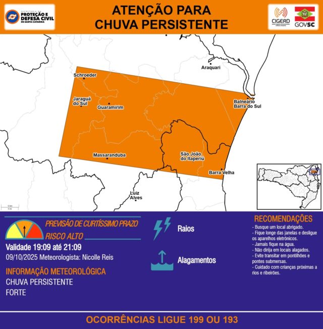 A Defesa Civil de Santa Catarina emitiu, na noite desta quinta-feira (09), um alerta para chuvas persistentes e de forte intensidade que devem atingir diversos municípios do Norte do estado nas próximas duas horas. O aviso inclui risco de descargas elétricas, alagamentos e deslizamentos em áreas de encostas.