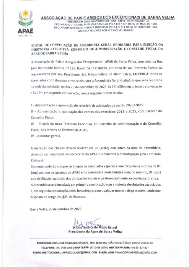 Edital de Convocação de Assembleia Ordinária para Eleição da Diretoria Executiva, Conselho de Administração e Conselho Fiscal da APAE de Barra Velha