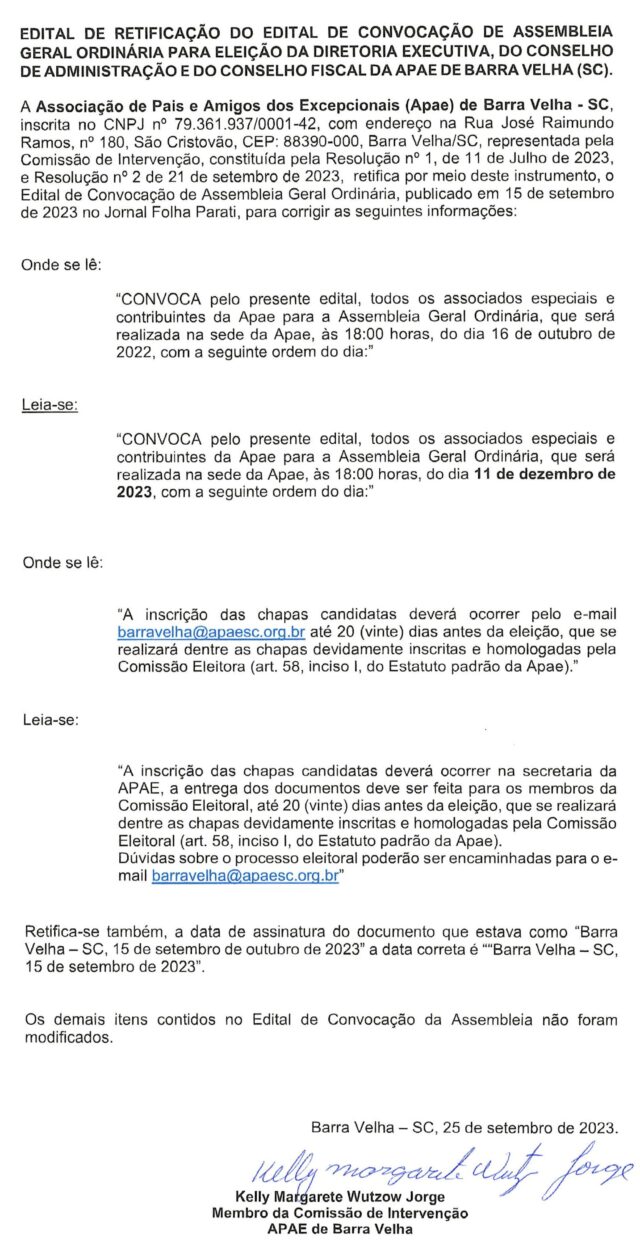 Edital de retificação do edital de convocação de assembleia geral ordinária para eleição da diretoria executiva, do conselho de administração e do conselho fiscal da APAE de Barra Velha (SC)