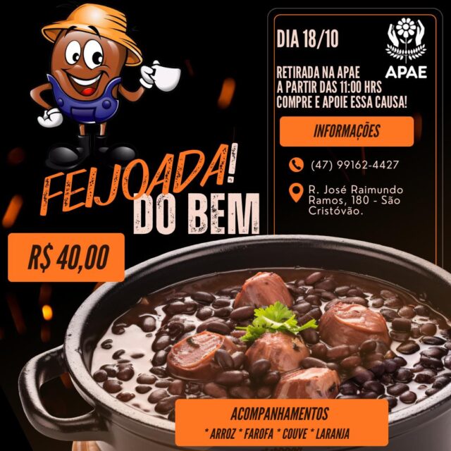 No próximo dia 18 de outubro, a APAE de Barra Velha realiza a deliciosa Feijoada do Bem, uma iniciativa que une solidariedade e boa comida em prol das ações da instituição. A retirada dos pratos acontece a partir das 11h, diretamente na sede da APAE, na Rua José Raimundo Ramos, 180 – Bairro São Cristóvão.