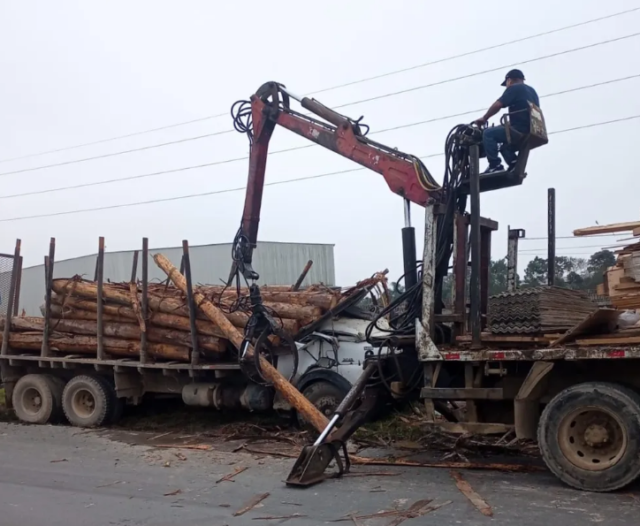 O condutor de um caminhão carregado de toras de madeira morreu, na tarde desta segunda-feira (24), após o veículo sair da pista na BR-470 em Navegantes, no Litoral Norte de Santa Catarina, e ter o material lançado sobre a própria cabine.