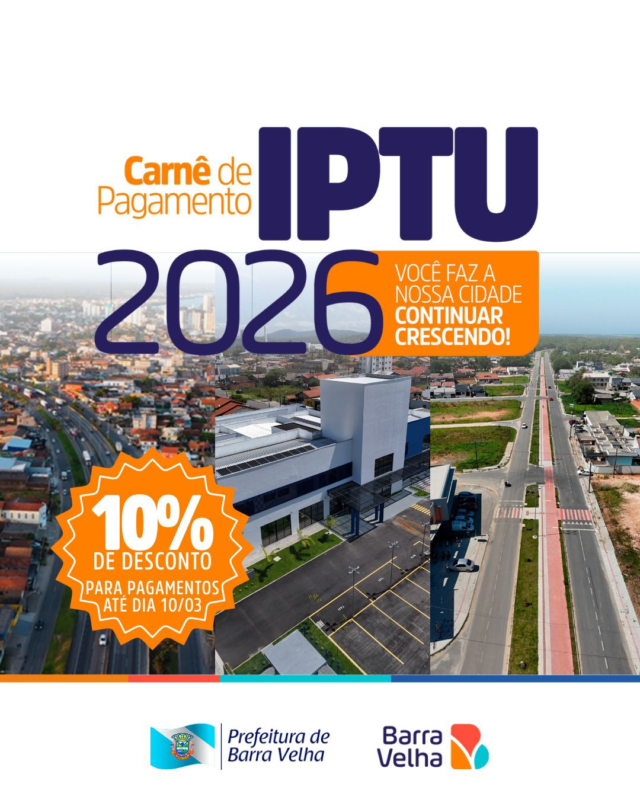 A Prefeitura de Barra Velha informa que os contribuintes que quitarem o Imposto Predial e Territorial Urbano (IPTU) até o dia 10 de março de 2026 terão 10% de desconto no valor total do tributo.