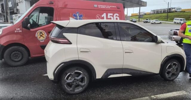 Uma motociclista ficou ferida após um acidente de trânsito registrado no início da tarde desta quinta-feira (13), na Av. Gov. Celso Ramos, no Centro de Barra Velha. A colisão envolveu uma motocicleta Honda Biz e um carro elétrico da marca BYD.