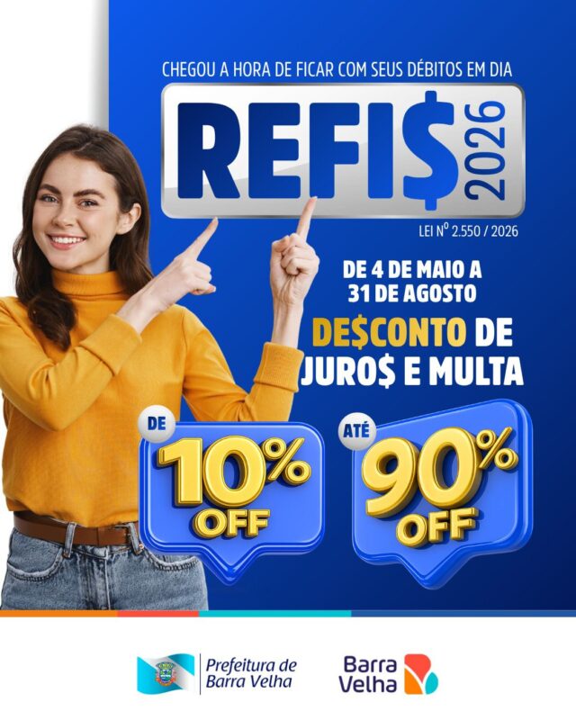 Barra Velha (SC) — A Prefeitura de Barra Velha anunciou a abertura do Programa de Recuperação Fiscal (REFIS) 2026, oferecendo condições especiais para contribuintes regularizarem débitos com o município. O prazo para adesão vai de 4 de maio a 31 de agosto.