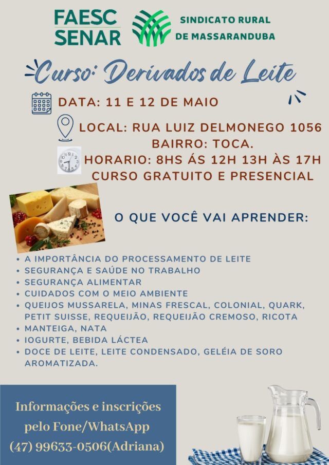 A Prefeitura de São João do Itaperiú, por meio da Secretaria de Assistência Social, em parceria com o Sistema FAESC/SENAR e o Sindicato Rural de Massaranduba, promove o Curso de Derivados de Leite, uma oportunidade gratuita de qualificação profissional voltada à comunidade.