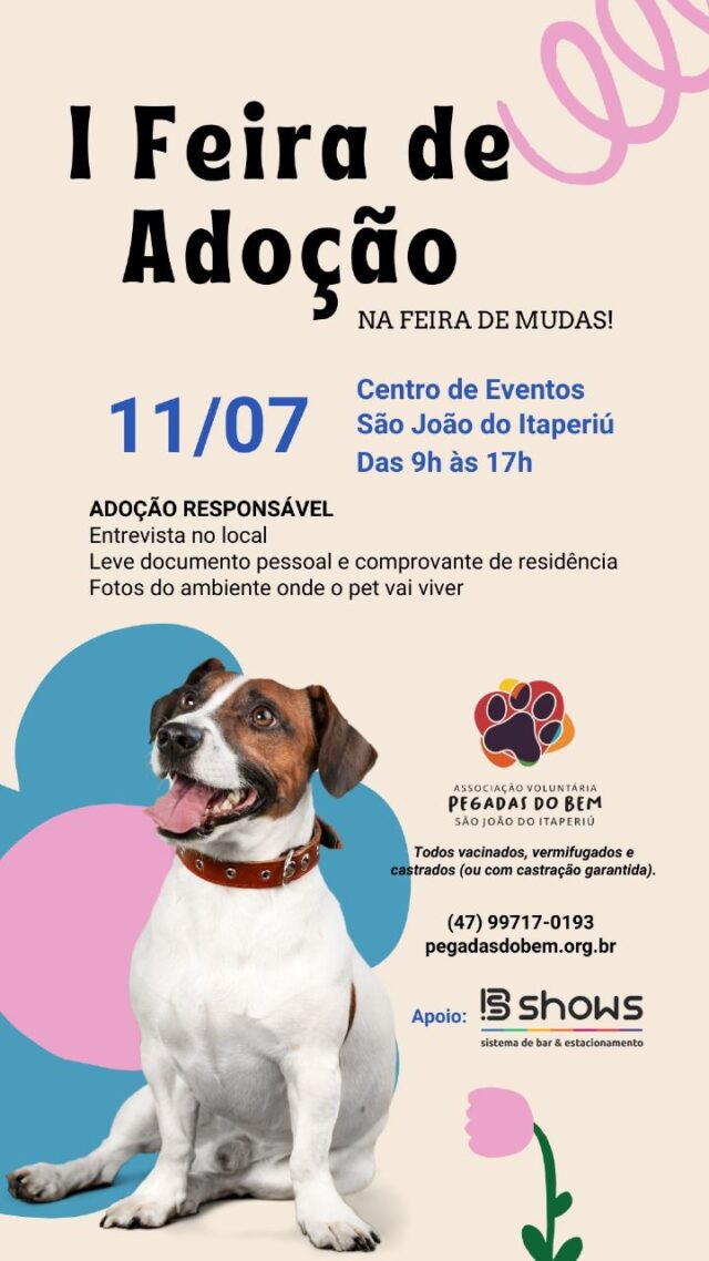 São João do Itaperiú, SC – A cidade recebe nesta sexta-feira, 11 de julho, a 1ª Feira de Adoção de Animais, promovida pela Associação Voluntária Pegadas do Bem durante a tradicional Feira de Mudas, no Centro de Eventos, das 9h às 17h. A iniciativa busca conectar cães resgatados com lares responsáveis e amorosos.