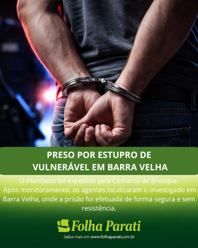 Barra Velha (SC) – A Polícia Civil de Santa Catarina cumpriu, nesta sexta-feira (27), um mandado de prisão preventiva contra um homem investigado pelo crime de estupro de vulnerável, previsto no Artigo 217-A do Código Penal.