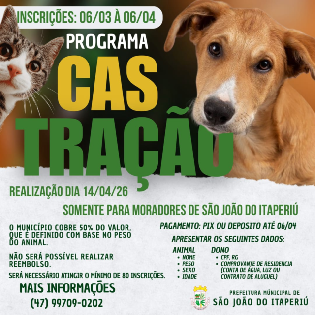 A Prefeitura de São João do Itaperiú abriu as inscrições para mais uma edição do Programa de Castração de cães e gatos, iniciativa que busca promover o controle populacional de animais e contribuir para a saúde pública e o bem-estar animal no município.
