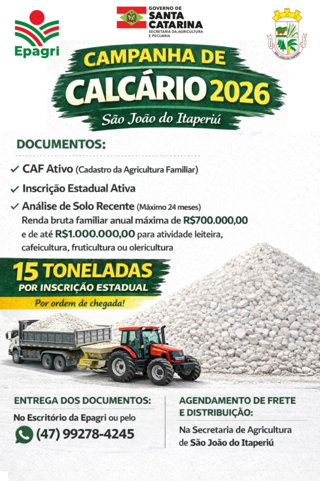 Os produtores rurais de São João do Itaperiú já podem solicitar calcário por meio do Programa Terra Boa – Calcário, ação do Governo de Santa Catarina voltada ao fortalecimento da agricultura e à melhoria da produtividade no campo.