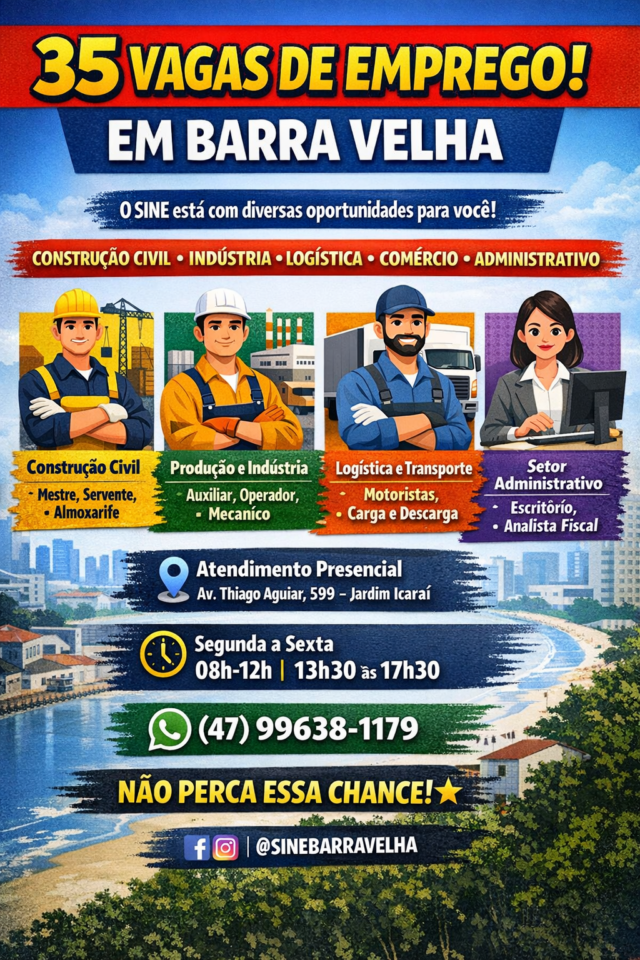 O Sistema Nacional de Emprego (SINE) de Barra Velha está com 35 vagas abertas para trabalhadores da região, contemplando oportunidades em diferentes áreas como construção civil, indústria, logística, comércio e serviços.