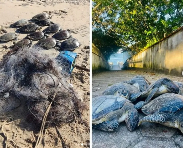 As 13 tartarugas-verdes (Chelonia mydas) eram jovens. Uma delas, que sobreviveu, tinha sinais de afogamento devido ao aprisionamento no petrecho. O exame também demonstrou que ela ficou presa pelo pescoço e nadadeira na malha da rede.